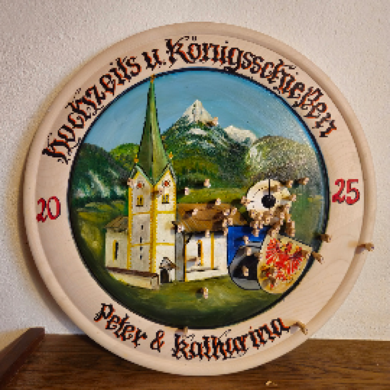Auch auf eine Bildscheibe durften wir heuer dank unseres Brautpaares Juliane u. Markus Strasser schießen. 59 Schuss wurden auf die Bildscheibe abgefeuert, den besten Schuss mussten sich Egidius Ritzer und Johann Strasser teilen.