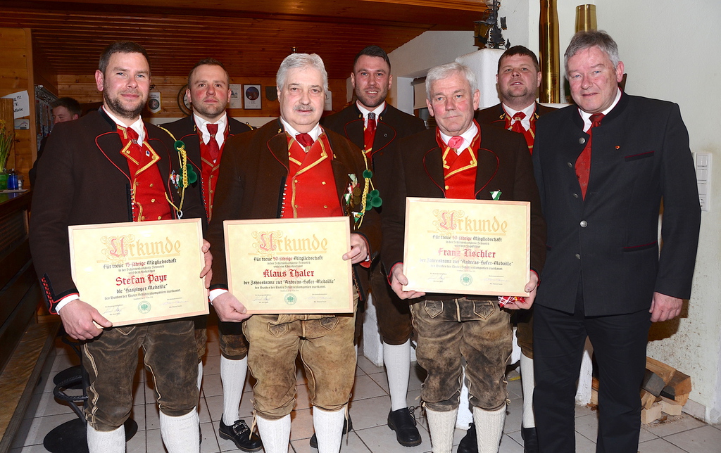 Für ihre 50-jährige Mitgliedschaft und ihre Treue zur Schützenkompanie wurden Ehrenleutnand Klaus Thaler und Ehrenmitglied Franz Tischler mit der Andreas Hofer Medaille mit Jahreskranz ausgezeichnet.